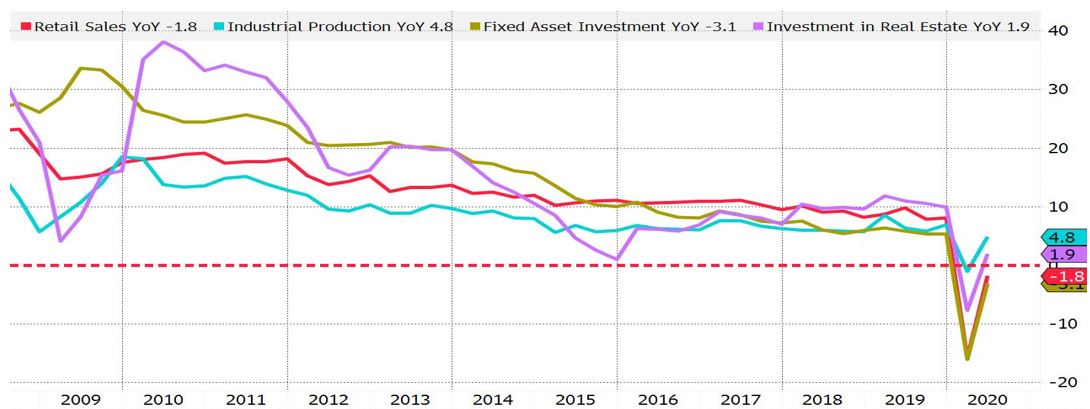中国六月工业生产4.8%连续3个月正常长,显示在复工之后中国工业活动快速回到疫情之前的状况,因为年增率是跟去年同期比,能够出现正成长表示已经回到疫情之前的水平,坦白说中国的工业生产数据好的不象话,但既然只有这个数据能参考就信吧!零售销售-1.8%未如市场预期的回到+0.5%,从消费端来看比较合理,受到新冠肺炎冲击之后民众的消费需求虽回升但步调缓慢,因为全球疫情大爆发,中国是出口大国,外销产业的结果最终会传导到内需,国际经济动态与未来的预期自然会影响民众的消费意愿。固定资产投资-3.1%反应最慢还在衰退中,固定资产投资要经济前景确定处于上升循环才会快速回升。房地产投资翻为正成长1.9%逐渐进入正轨。
