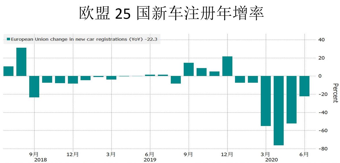 欧盟25国新车注册率年衰退22.3%,是2020以来连续第6个月衰退,期间出现了新冠肺炎导致的封锁所以造成新车销售年增率大衰退,4月创下创纪录-76.3%,但疫情控制后各国逐渐解封新车销售却未大幅成长,主要还是各国解封进度虽有秩序但缓慢恢复,加上新冠肺炎疫情再次重燃,民众对于经济前景的担忧导致高单价产品消费仍然受到影响。第三季新车销售年增率衰退幅度应该会逐渐收敛。