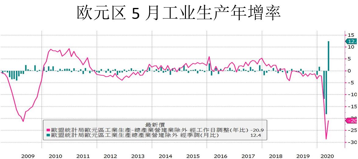 欧元区5月工业生产月增率12.4%,虽然低于市场预期的15.0%,不过5月欧元区多国解封单月出现大成长本就是正常合理的现象,不论是12.4%还是15%都是可以接受的数据,年增率-20.9%也低于市场预期的-18.9%,欧元区的经济数据揭露的时间较慢,现在已经7月下旬了才看到5月的数据,对金融市场不会有什么明显的影响,特别是在新冠肺炎疫情封锁又解封这样史无前例的冲击下,经济数据月增率出现V转、年增率还在低档都是搭配现况的正常表现,重点是未来的方向怎么走,欧元区的疫情控制比美国好很多,基本上各项经济数据逐渐回到正轨是必然的方向。
