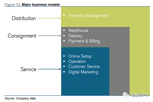 宝尊从“基于分销”的模式开始,从其合作伙伴出选择并购买商品,随后通过官方品牌商店或其自身直接向消费者出售。同时宝尊也从重资产模式转向轻资产的“非分配”模式,除了提供IT解决方案,网店运营、数字营销、客户服务等电子商务服务的收入模式外,还提供寄售模式,仓储和配送服务。