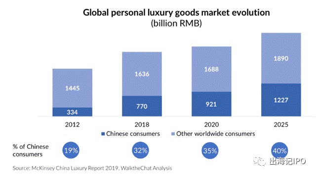 市场预期全球个人奢侈品市场将从2018年的2.4万亿元增长至2025年的3.1万亿元,其复合年增长率为3.7%;而市场增长的很大一部分将是因为受到越来越多富裕的中国消费者推动,这些消费者将促使中国个人奢侈品消费支出从2008年的7700亿元人民币增长到2025年的1.227万亿元人民币(年复合增长率为6.8%,几乎是全球3.7%增长率的两倍)。从2018年到2025年期间,中国奢侈品市场增长将占全球增长的64%,而中国在全球个人奢侈品市场的份额预计将从2018年的32%增长至2025年的40%。