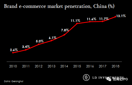而据中国信息研究提供商格隆汇数据显示,截止2018年,品牌电子商务的渗透率仅为13%。所以随着收入的不断增长将有助于品牌商品对中国消费者的吸引力。