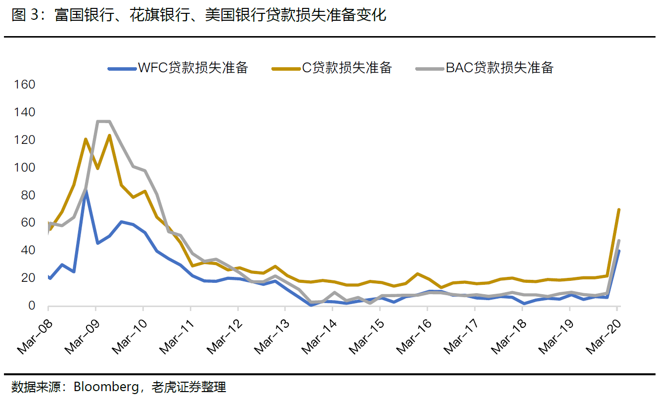 摩根大通贷款损失减值拨备增加近五倍的影响,净利润同比降三分之二;美国银行贷款损失减值准备同比增加四倍,净利润几乎腰斩;富国银行受营收下降和贷款减值准备增加双重打击,净利同比降近九成。花旗集团营收逆势增长一成,飙升的贷款减值准备使盈利下降近五成。摩根大通,美国银行和富国银行贷款损失拨备更是已经达到了金融危机以来最高水平。贷款损失减值拨备为什么这么高?