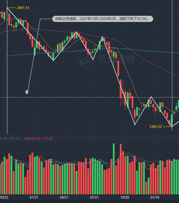 7.2007年10月-2009年03月,纳斯达克指数历时1年半下跌了55.8%,2009年3月开始反弹至2011年5月再创新高,历时2年多时间。