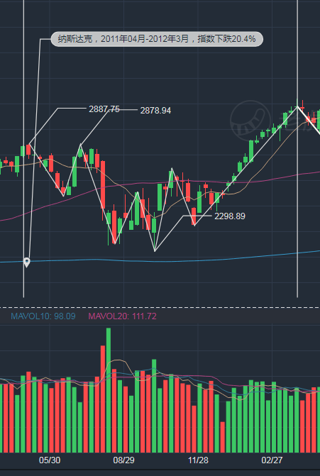 5.2011年04月-2012年01月,纳斯达克指数下跌了20%,纳斯达克指数经过三轮下跌探底,并经过2轮反弹至新高,历时9个月。