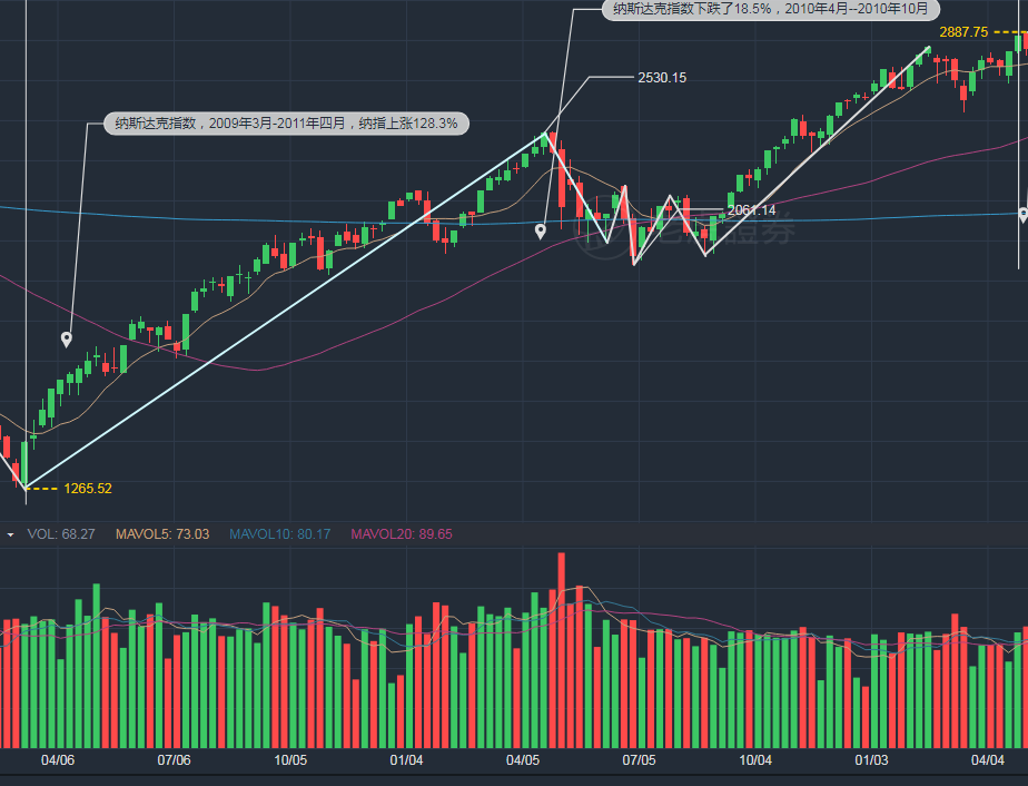 6.2010年4月-2010年10月,纳斯达克指数下跌了18.5%,纳斯达克指数经过三轮下跌形成双底结构,并后续直接反弹至新高,历时半年。