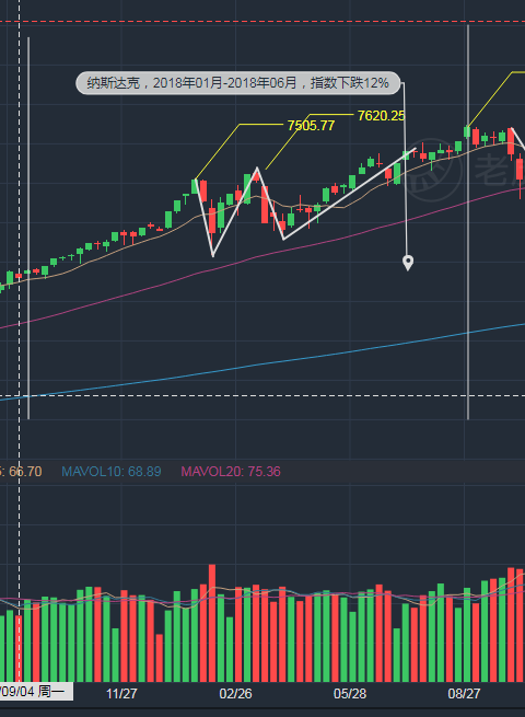 2.2018年01月-2019年06月,纳斯达克指数下跌了12.7%,指数从底部反弹至新高后经过1次回调恢复上升趋势,历时半年。