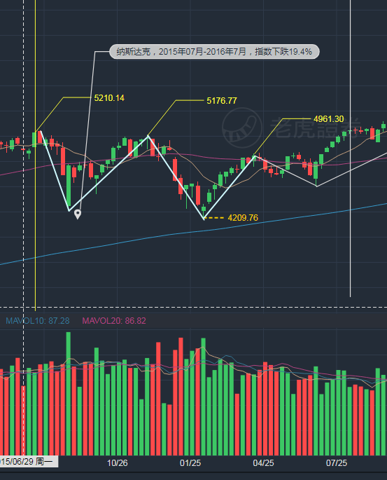 3.2015年07月-2016年07月,纳斯达克指数下跌了19.4%,纳斯达克指数在第一段下跌之后,反弹至接近新高后第二次探底,反弹过程中经过两轮回调重新恢复到上升趋势,历时1年。