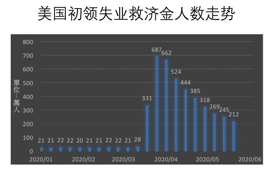 美国劳工部5月28日发布的最新失业数据显示,自3月中旬起,全美多数民众配合政府命令新冠病毒居家避疫,商家大规模的停业,效应扩及各个产业,美国申请失业补助者累计近4,100万人,到5月23日为止,新申请失业补助者为212万人,是近二个半月申请失业补助人数首度减少,不过根据历史标准来看,申请失业的美国工人人数仍然异常的高,这表示企业正处困境或将永久缩减规模,美国4月份的全国失业率为14.7%,为大萧条以来的最惨的景况,许多经济学家预测,5月的失业率可能会接近20%,2008年金融海啸失业率创新高,过了7年才回到相对低位,这次要花多少时间就看疫情的发展。