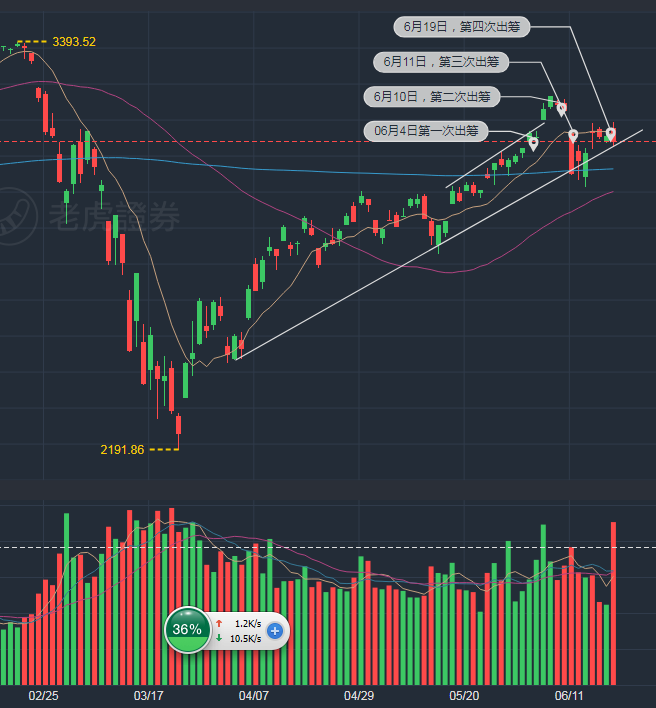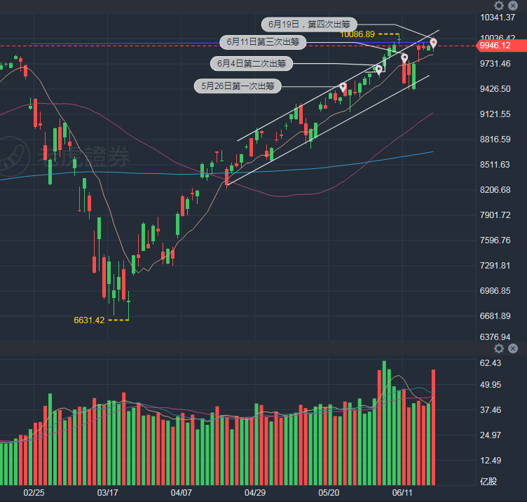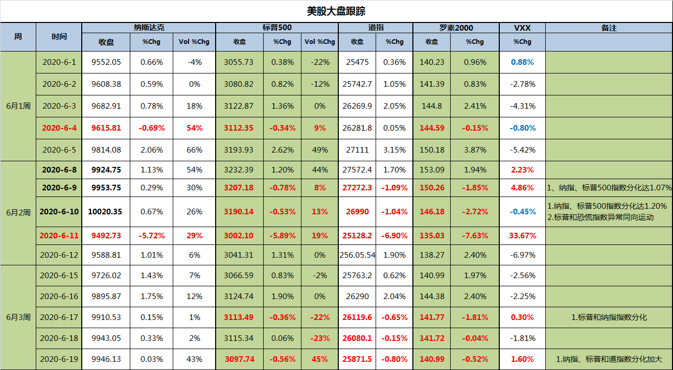 6月11日,三大指数创自底部反弹以来的最大日跌幅及成交量,虽然纳指后一周经过了强力修复,但是标普和道指只是勉强维持在上升下轨线附近,11日的大跌打开了市场的下跌和回调的想象空间,是大盘改变趋势的一种试探,也是前期的获利筹码的比较集中的清仓,也证明本次上升趋势并不是那么坚不可摧,所以后续的任何消息面的风吹草动,都有可能出现大盘抛售的行为!