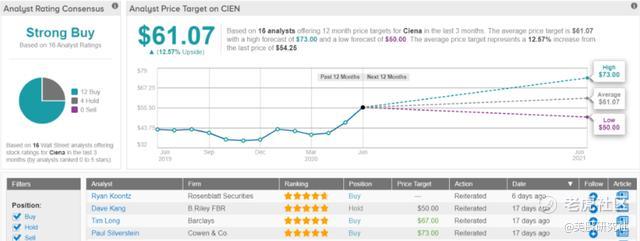 CIEN对该股的强烈“买入共识”评级是基于12个令人印象深刻的“买入”评级,表明投资者对该股有信心。只有四位分析师将其评级定为“持有”。平均目标价为61美元,这一变化意味着较当前65美元的股价有12.5%的上涨潜力。