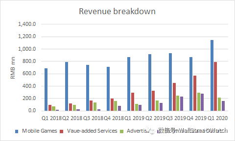 哔哩哔哩致力于将公司打造成为面向中国年轻人的“入门级”视频平台,并在手机游戏,增值服务、广告和电子商务领域开展业务。目前手机游戏依然是公司最大的收入来源,在2020年第一季度中占整体营收的50%。但随着哔哩哔哩对于内容投资,在线视频消费量增长,以及流媒体直播和高级用户获取的投资,公司的增值服务收入和广告也表现除了强劲的增长态势。