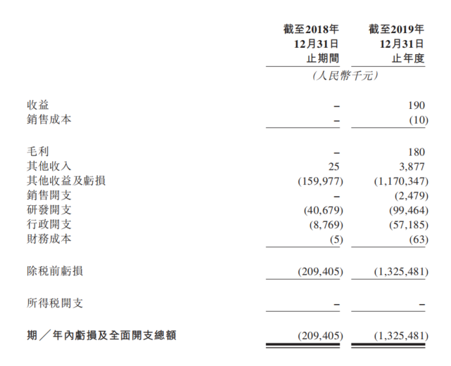 2018年、2019年,欧康维视录得亏损人民币2.09亿元、13.25亿元,亏损主要由较高研发开支以及新增员工所需的行政开支大幅扩大所致,两年研发开支分别为4067.9万元和5.72亿元。2019年的19万元收入由OT-401通过博奥实验计划获得有限销售收入所实现。