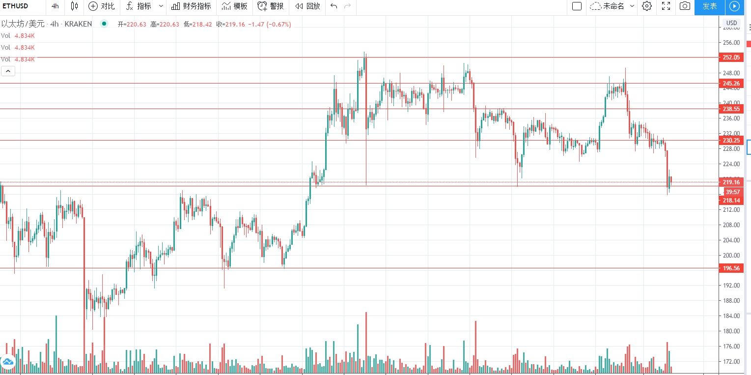 以太目前跌到了218平台强支撑 ,如果有效跌破216下个位置看196附近。以太这波跟大饼走得很强,今年利好概念比较多持续到2020年年底 主流里面大书最看好的主流币种之一 最近DIFI概念炒的比较热 eth 就身处其中 所以跌下来大家可以放心大胆买长线持有!目前上方压力227支撑216