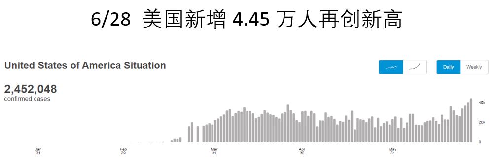 美股目前就是在乐观的期待与残酷的现实中交战,美国阳光州疫情爆发,新冠肺炎确诊人数爆增,德州、佛罗里达州住院人数创新高,休斯敦已经发出医疗体系不堪负荷的警告,以现况来看很难期待夏天疫情会趋缓,现在每天都有疫情恶化的消息,最终市场对疫情无感而继续上涨?还是被疫情扩大而压下来?只能边走边看,交战的过程只有短Trade做当冲可能是比较安全的交易策略。