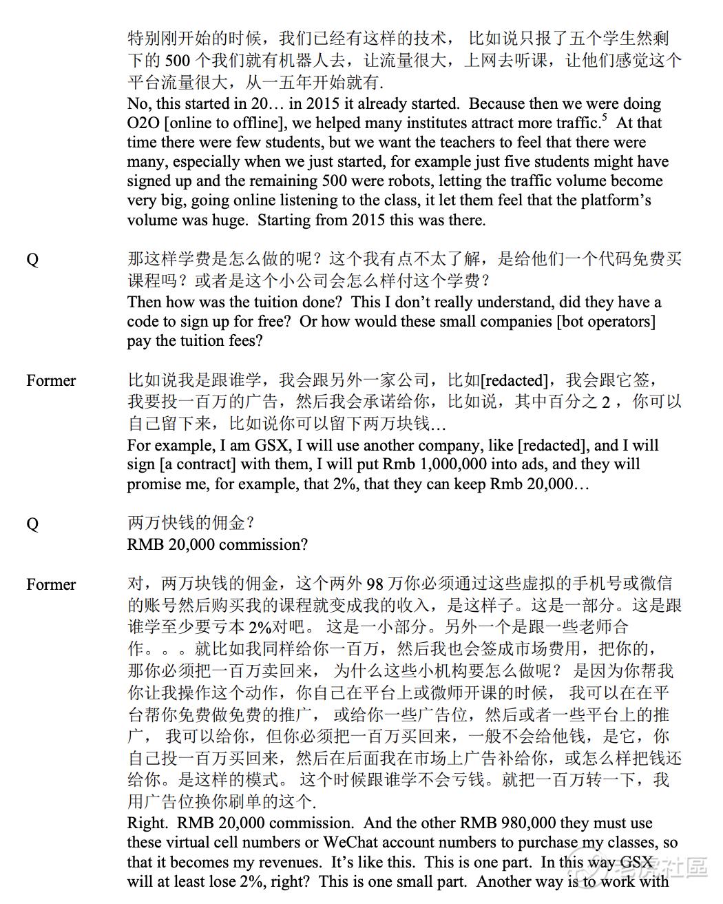 有些人专门报名参加课程并付费。 GSX显然提供使交易合法化所需的现金,并通过销售和营销费用或销售线成本来记录生成这些机器人运行的大部分成本。这位前经理任命了三家分别向GSX提供机器人用户的公司,其中包括味十(由GSX拥有的应用程序)和百家友联(占GSX的30%)。