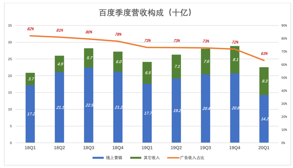 近年百度线上营销收入(即广告费)占比下降,收入多元化趋势明显:2016年Q1,广告收入占总营收的94%;2018年、2019年、2020年Q1,广告收入占比分别降至82%、72%、63%。