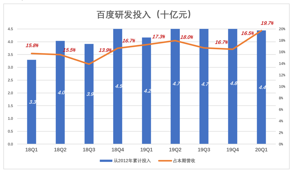 2018年Q1,百度毛利润11亿,研发投入33亿,占营收的15.8%,相当于毛利润的30%;2020年Q1,百度毛利润降到79亿,研发投入44亿,占营收的19.7%,相当于毛利润的56%!