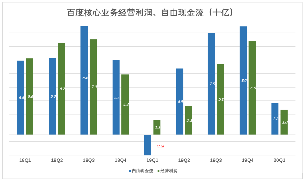 除2019年Q1,百度核心业务(即剔除爱奇艺)自流现金流(净利润减资本性投入)始终为正。