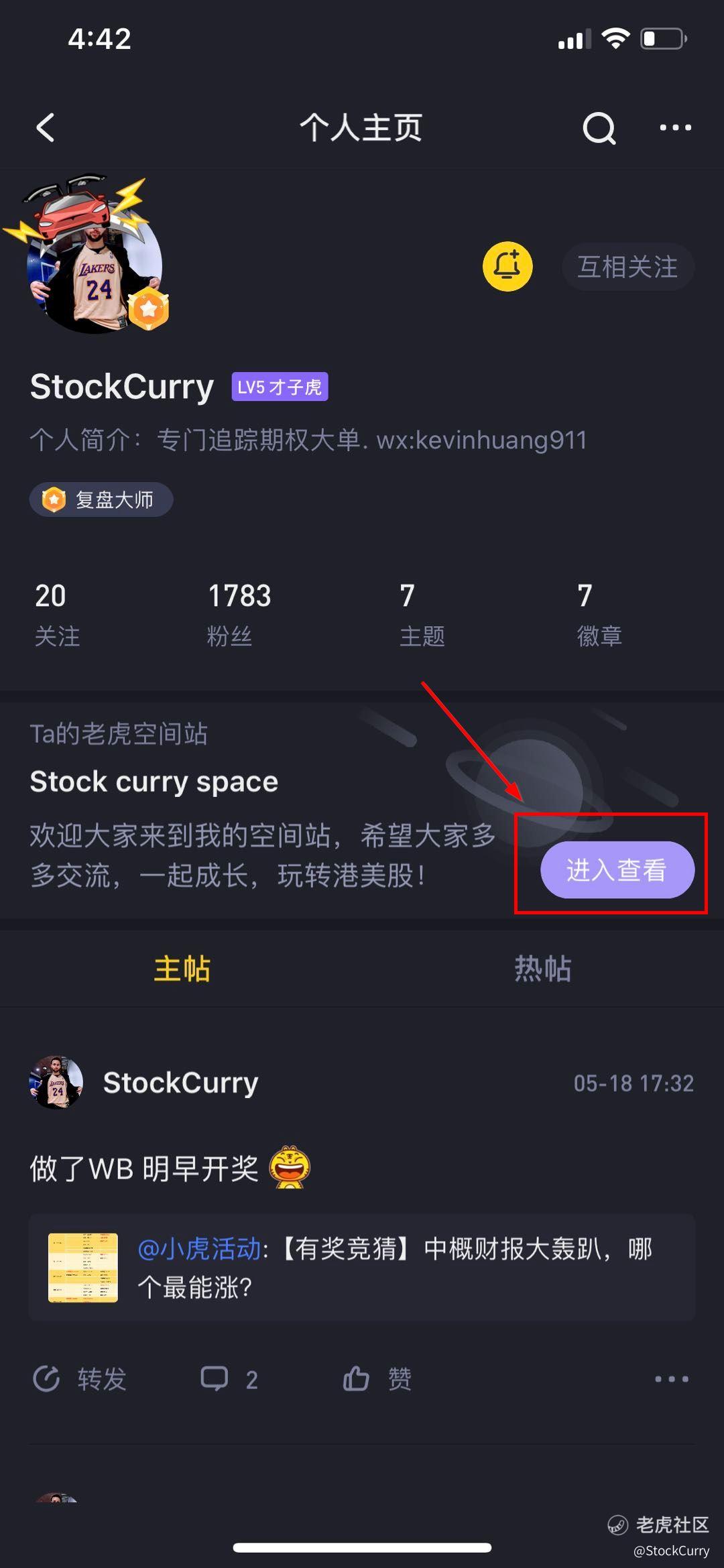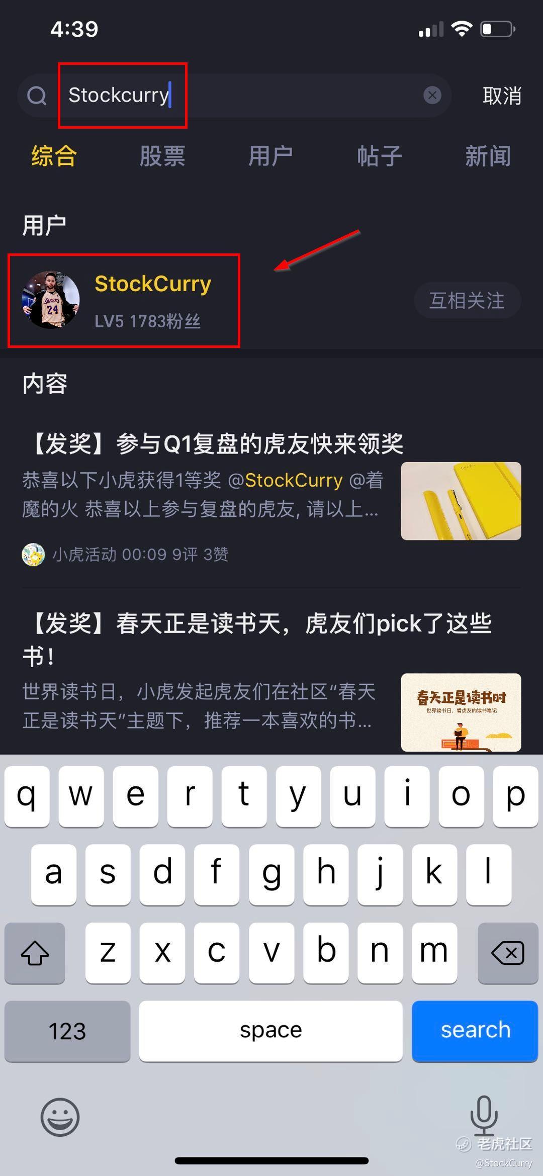 1.打开老虎app后点击社区,搜索我的ID:Stockcurry
