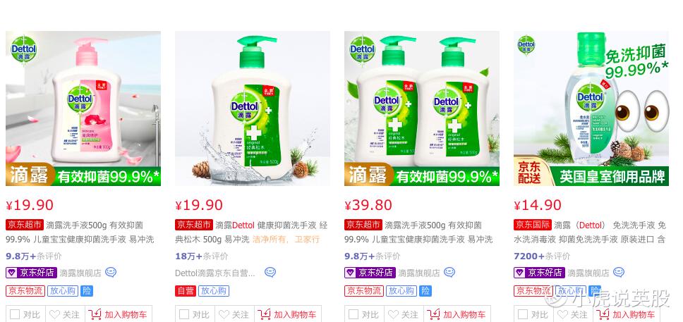 那最近欧洲人美国人和中国人都在买买买公司的产品。小虎们可以看一看一些滴露消毒剂产品从$京东(JD)$。 公司也在淘宝有商店$阿里巴巴(BABA)$ $阿里巴巴-SW(09988)$ 。
