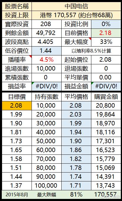 中国电信是我第一个购买的港股,源自于在台湾看到电信股是防御型的股票,并且有稳定的配息!特别是中国人的生活已经和网路密不可分,我很难想像中国移动和中国电信会倒闭的可能性(联通就...),不过在这次熊市火苗露出前,我在2.98附近全部出清,最终这笔长期投资是小赔收场,但这波修正后,已经跌出了迷人的价值,分享我为什么把$中国电信(00728)$列为长期投资的股票,短线上我认为还会跌!但不知道底部在哪,所以用向下摊平方式接近底部