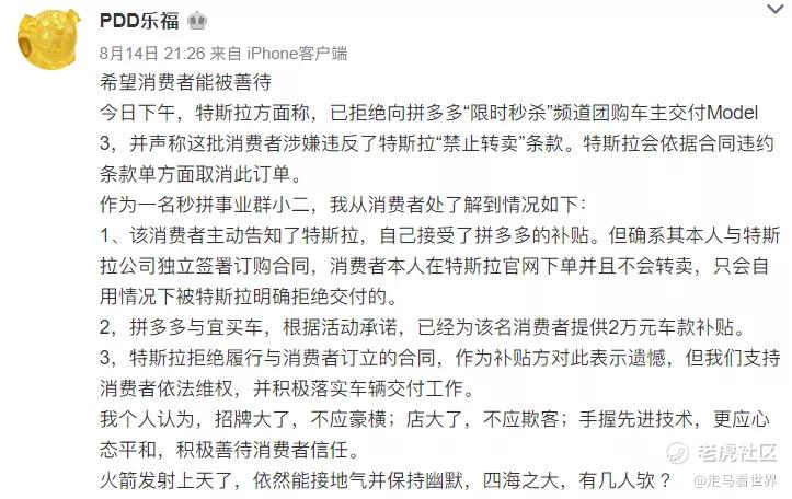 对于特斯拉的拒绝交付,拼多多紧急回应:
