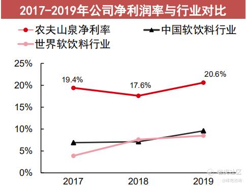 从净利润来看,近三年,农夫山泉净利润分别为33.86亿元、36.12亿元、49.54亿元,净利率分别为19.4%、17.6%、20.6%。这一盈利水平同样远高于同业。