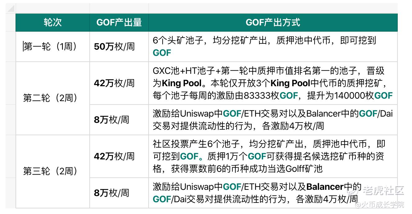 关于代币分配:机构占5%,机构代币不是一次性分发的,是写进智能合约按日线性缓慢分发的。第一周没有任何的机构投代币的释放。 95%的GOF通过挖矿产生,刚刚在前面也提到了首期的Farm挖矿总共为3轮。每周挖矿产出50万枚GXC。这些挖矿的GOF除了会用于激励Farm池子中的代币质押者之外,还会去激励在uniswap等DEX中为GOF交易对提供流动性的行为。这将能大大提升GOF的交易深度。