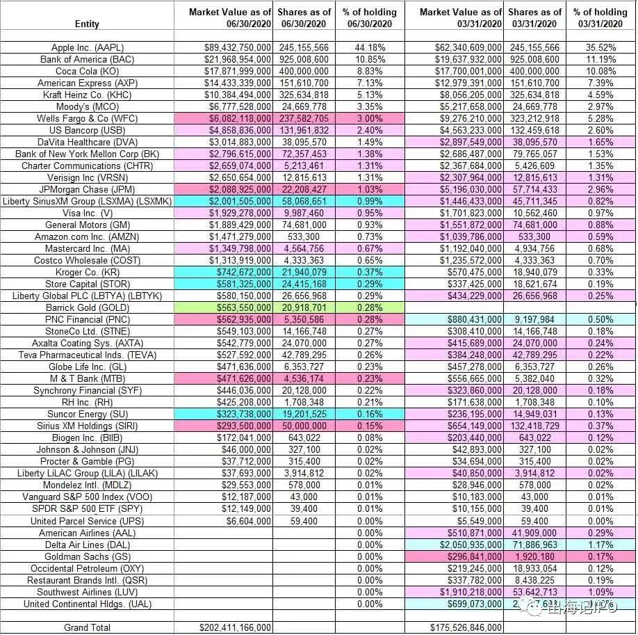 下表显示伯克希尔哈撒韦在2020年第二季度持有的13F股票的变化: