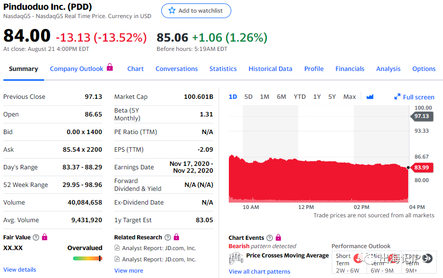 8月22日,拼多多于美股周五盘前发布2020年第二季度财报。财报发布后,拼多多当日收盘暴跌逾13%,报84美元,市值蒸发近千亿元。