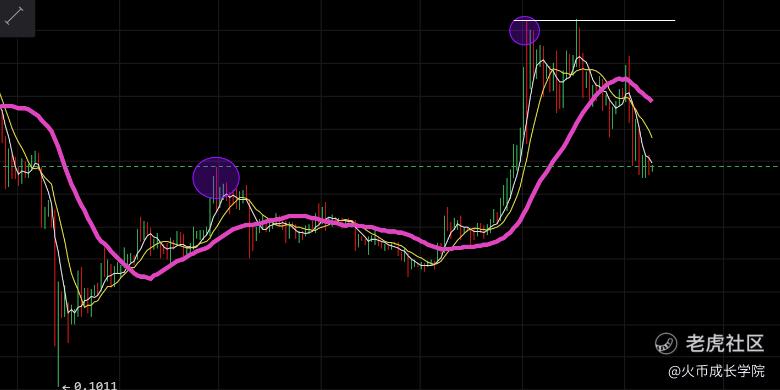 首先我们看到这个下方这个紫色圈是两个月以来的盘区的高点,那么可以作为一个突破的关键点。当价格成功突破后就是一路拉升,然而第二个紫色圈在被越过之后呢,却没有像什么之前一路突破后继续保持长强有力的上升趋势。这就是一个反面案例,遇到这种情况就应该果断卖出,甚至是做空。
