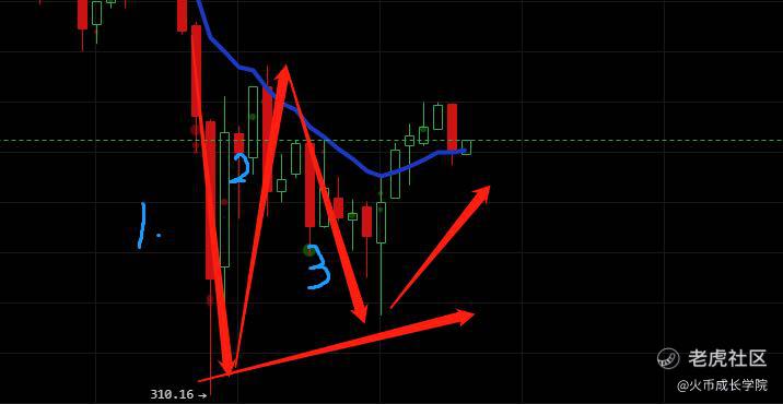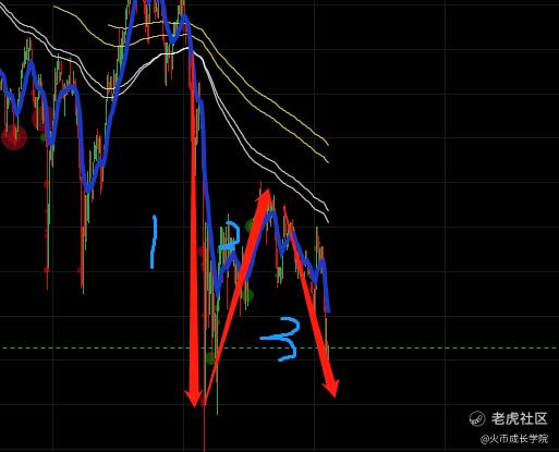 接下来会出现一个反弹到次高点。这个点这个点是一个非常好的峰点,80%的概率它都会继续跌下去。这个时候啊我们就要去观察此次下跌后,能不能接受住前面一个低点的测试,如果测试成功了,我们就可以去考虑做第四段。