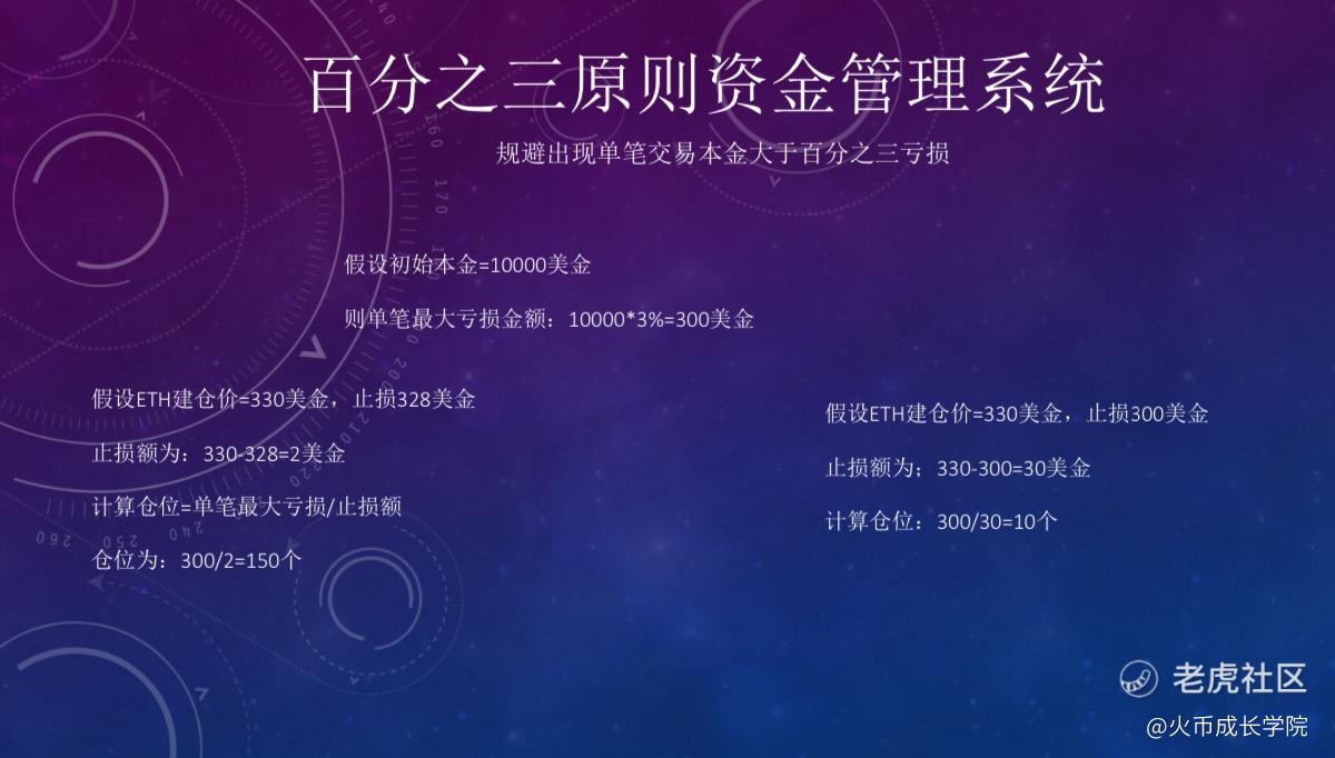 我们接下来举个例子,假设你的本金是一万美金,那么系统就会要求你每次承担的最大风险就是控制在一万乘以3%,那么就是300美金的风险。接下来我们就要通过这个金额去调节我们的仓位。大家记住这个300美金不代表仓位,而是代表你单笔最大的亏损额。不管是合约还是现货,都是适用的。那比如我们决定在330美金,买入以太坊,那么这个时候你的止损假设我是设在328,这个时候我们的止损金额就是330减去328,一个2U 的止损。我们可以拿300美金的最大亏损额去除以2U,就可以得出我们这次要开的仓位大小,即150个以太坊。