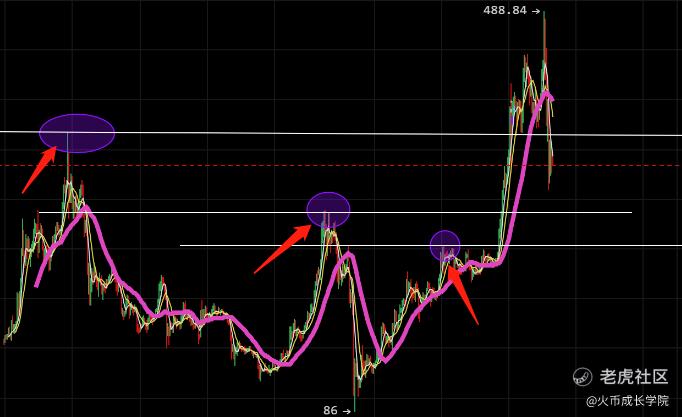 那么我拿前段时间我们的ETH去作为一个例子。图中三个紫色圈圈都属于关键点,它分别为253.66、280.36、366.5。上述的这几个点位,在进场之后都是一路张扬并且没有任何的回撤出现,我们要做的就是在确认价格越过的那一瞬间买进,并且在关键点稍下方设定一个非常靠近的止损,防止假突破。这个时候我们就可以去使用前面讲到的百分之三原则。
