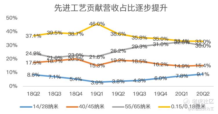 目前,中芯国际已经掌握14纳米制程技术,并在2019年第四季度贡献有意义的营收,从今年二季度数据来看,先进工艺贡献的营收占比逐步提升,未来有望继续放量。