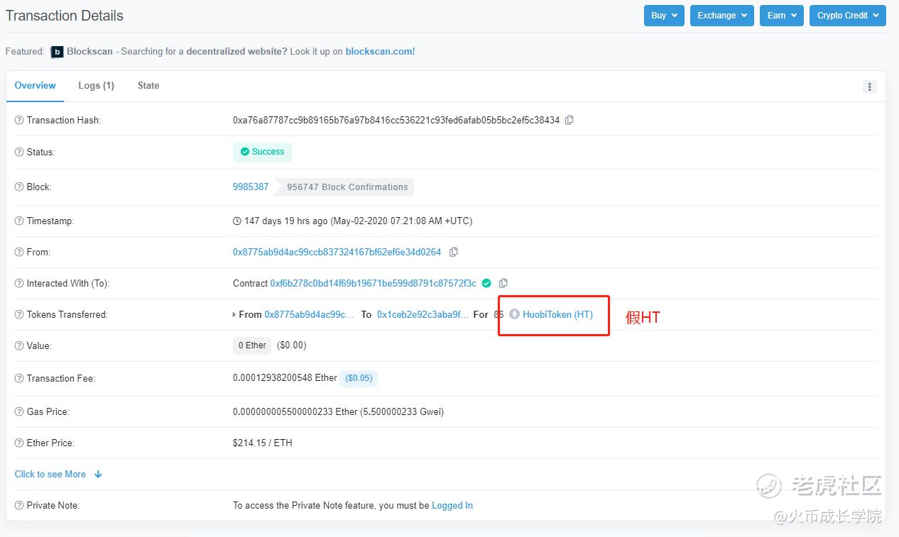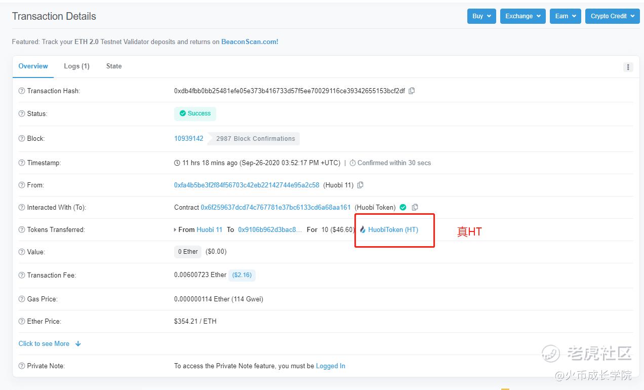 2、诈骗方式:假借“搬砖套利”的说辞,诱导用户将个人ETH转入某钱包中。承诺会按照比例给用户转HT。实际转的为假“HT”(非火币官方发行的Huobi Token)从而骗取用户资产。