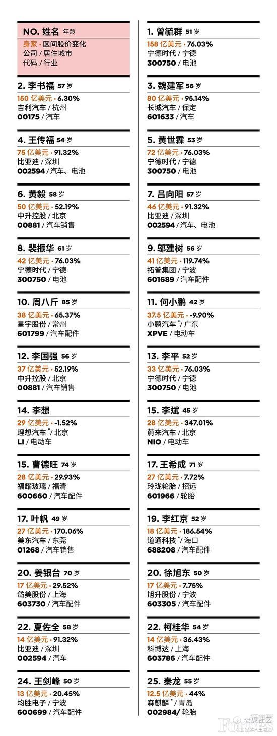 造车新势力阵营中,身价最高的竟然是第11位的小鹏汽车创始人何小鹏,身价37.5亿美元,李想29亿美元排名第14位,蔚来汽车创始人李斌以28亿美元身价,仅仅位列第15位。$宁德时代(300750)$$比亚迪(002594)$$蔚来(NIO)$