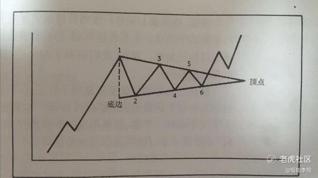 图1到图3是各种三角形的图例。对称三角形(图1)具有两条逐渐聚拢的趋势线,上面的直线下倾,下面的直线上升。左侧的垂直虚线,表示了形态的高度,称为底边,两条直线在右侧相交,交点称为顶点。对称三角形也被称为“绕线筒”,显然这是针对其外形而称的。