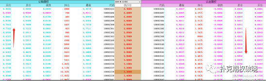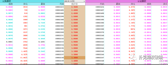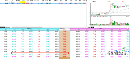 在T型报价图里,最简单的理解方式就是看期权费贵不贵,看到平值期权的底色,越贵区域就是实值,越便宜就是虚值,在图里我用箭头表示,所以T型报价里,左上角是实值看涨期权,右下角是实值看跌期权。