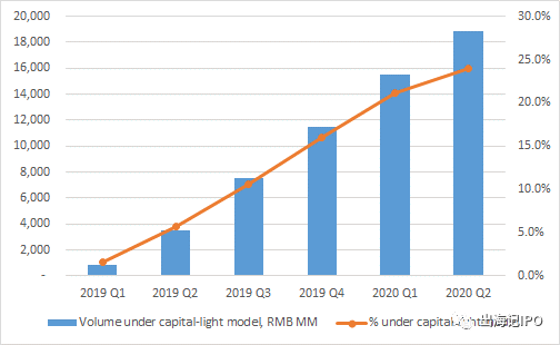 对于360数据来说,其所谓的“轻资本模式”似乎运行良好。在这种模式下,截止2020年第二季度,未偿贷款余额的比例一直稳步增长至近25%: