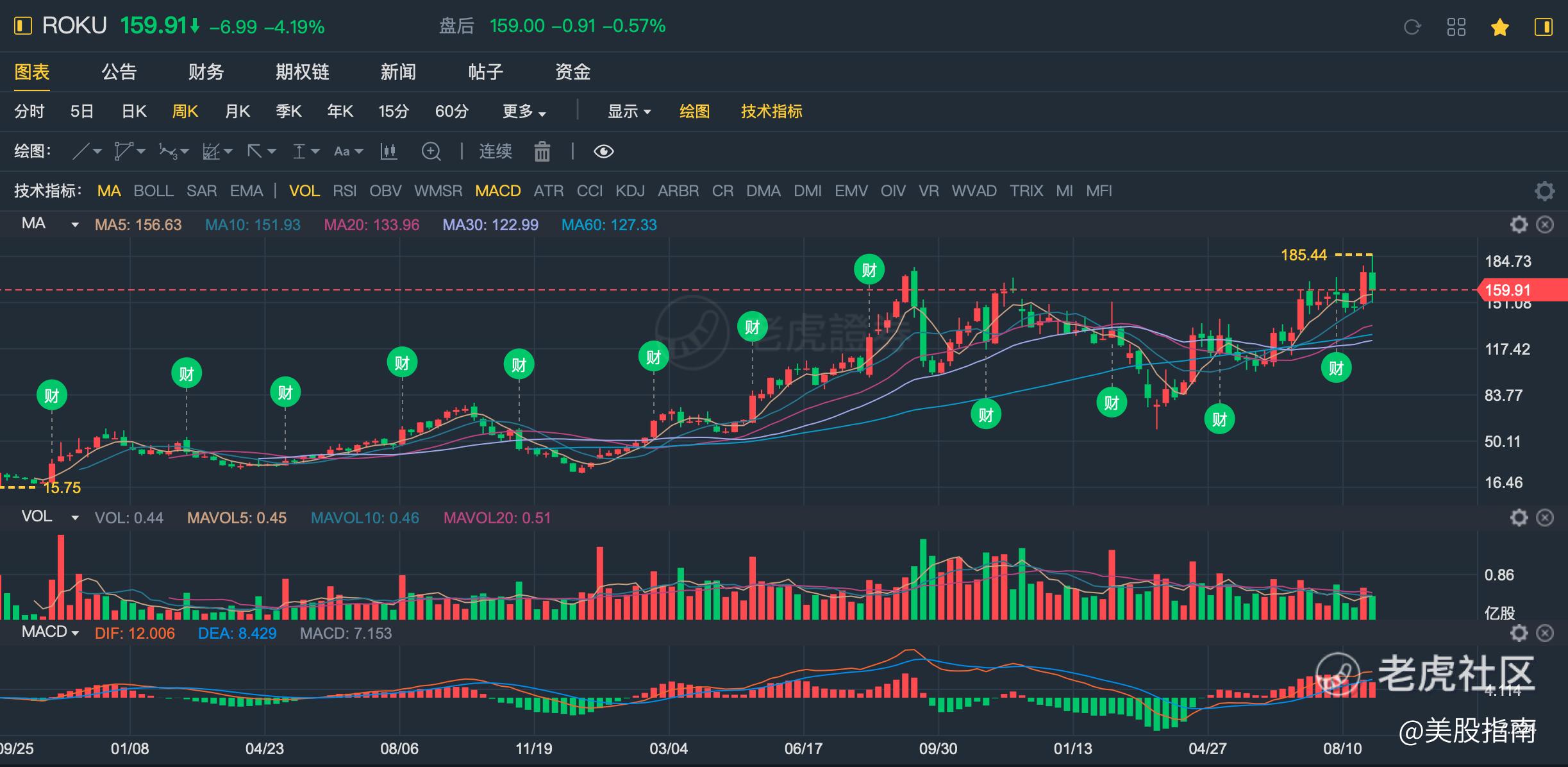摘要: 从周线图来看, 美国最大的流媒体电视平台Roku前几天被花旗提升评级后, 刚刚突破历史新高, 不过随着大盘回调了, Roku 回到了突破前的159左右。下面以前盘点一下最近Roku 发生的事情。本文首发于公众号: 美股指南