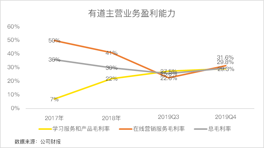 有道的两大主营业务,分别是学习服务和产品以及在线营销服务,前者主要包括K12业务、成人教育业务和智能学习产品,后者是有道传统的收入来源,随着经济波动易受到广告主缩减开支影响,有点看天吃饭的意思。