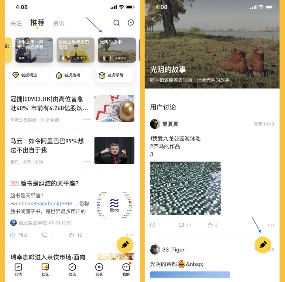 请将你的老虎APP更新到最新版本6.6.0,直接在社区--推荐—“光阴的故事”里面添加图片或者视频。