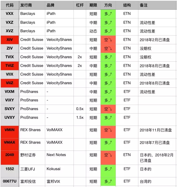 除VXX外,还有很多对标VIX期货指数的ETP产品,有短期的、中期的、有反向的,还有加杠杆的。这里罗列了一个清单,它们中的一些已经不复存在了,但是本着考古博学的精神,还是列出来让大家见识见识: