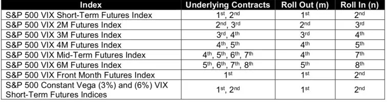 这些指数都是用两个月或几个月的期货合约构成底层资产,不断买进远的,卖出近的,保证总体持仓总是约等于一个固定期限。例外的是VIX Front Month Futures Index,这个指数是只持有最近月的合约,直到到期前3天,再切换到下个临近月份的合约。