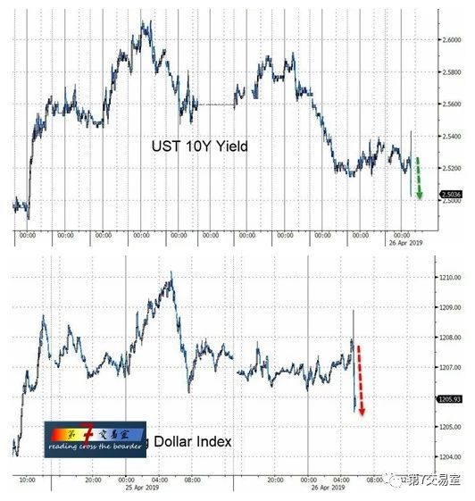 黄金周五的涨幅占了周度涨幅的50%以上,而且VIX指数在周五之前已有近5个百分点的涨幅,周五的大跌后,周度涨幅几近收平,美元指数和美债利率几乎在GDP公布的同一时间出现了大跌走势。见下图