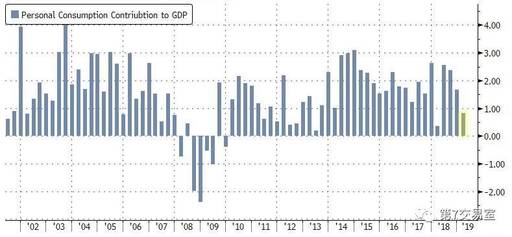 但真正关乎经济发展的,也是美联储看的关键数据,则是消费和投资,这些项表现普遍疲软。比如:个人消费支出(PCE)和资本支出(CapEx)仅增长1%左右,我们看一下各项对第一季度GDP贡献的柱状图: