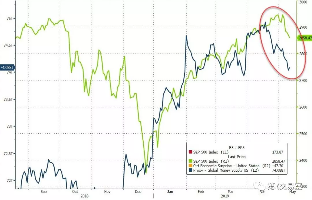 最后,我们看一下全球央行货币供应量和标普500指数的对比,这个背离已经消失转为同步下跌了,这个指标的预警作用看来非常起效。