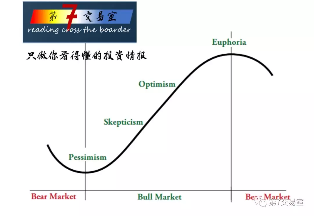有市场底部的悲观情绪,经过上涨阶段的怀疑情绪,乐观情绪,走到市场顶端的极端乐观情绪,而后情绪再慢慢下跌,转为怀疑阶段和悲观阶段。